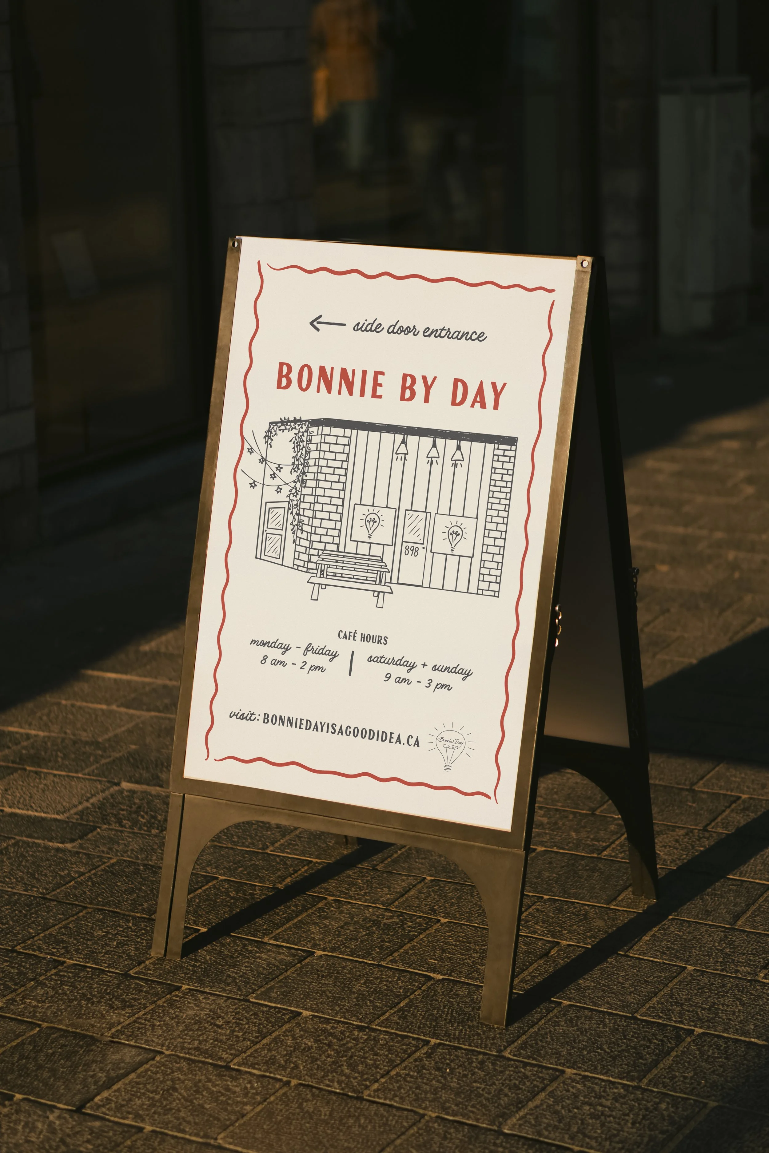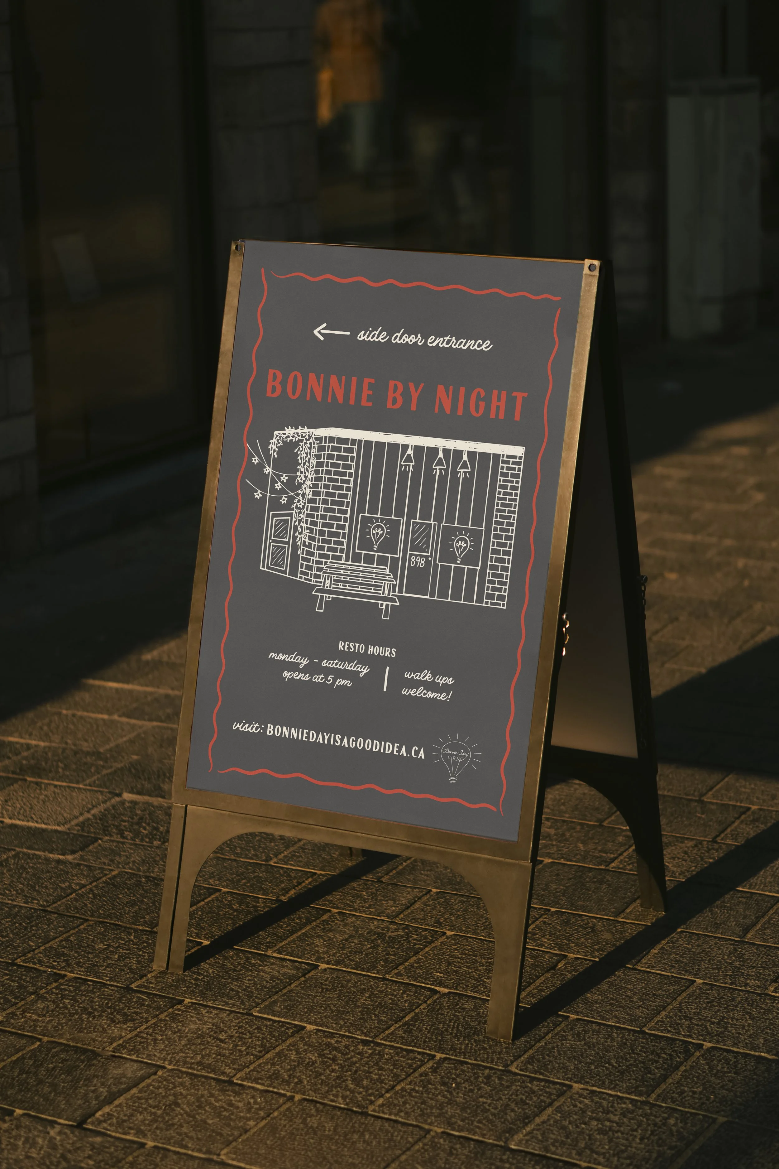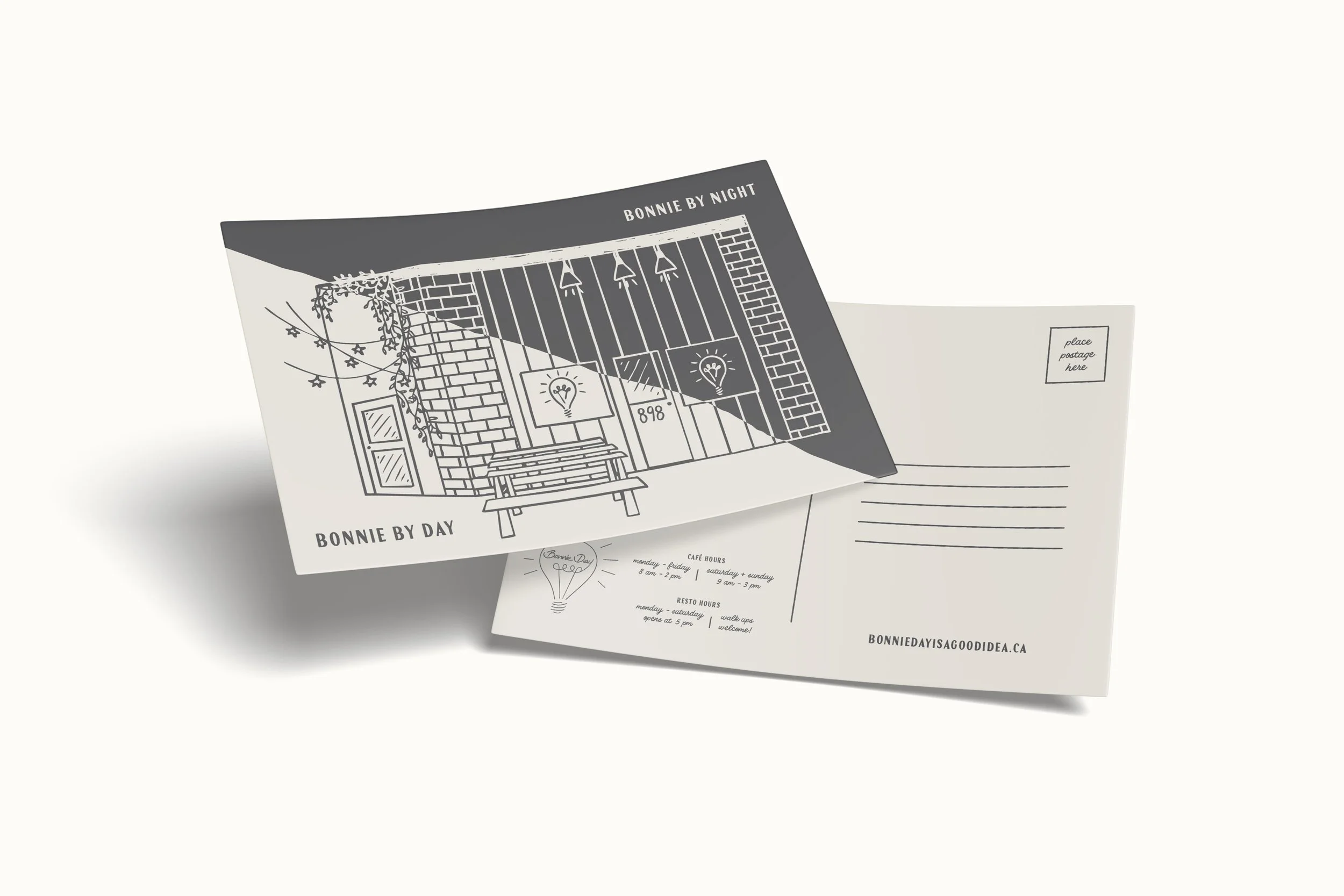 The visual solution included two custom-illustrated signs representing Bonnie by Day and Bonnie by Night. Each sign features a stylized illustration of the restaurant, visually expressing the shift in mood from relaxed daytime café to the evening dining destination. The illustrations balance a playful character with a refined aesthetic that reflects the restaurant's personality.