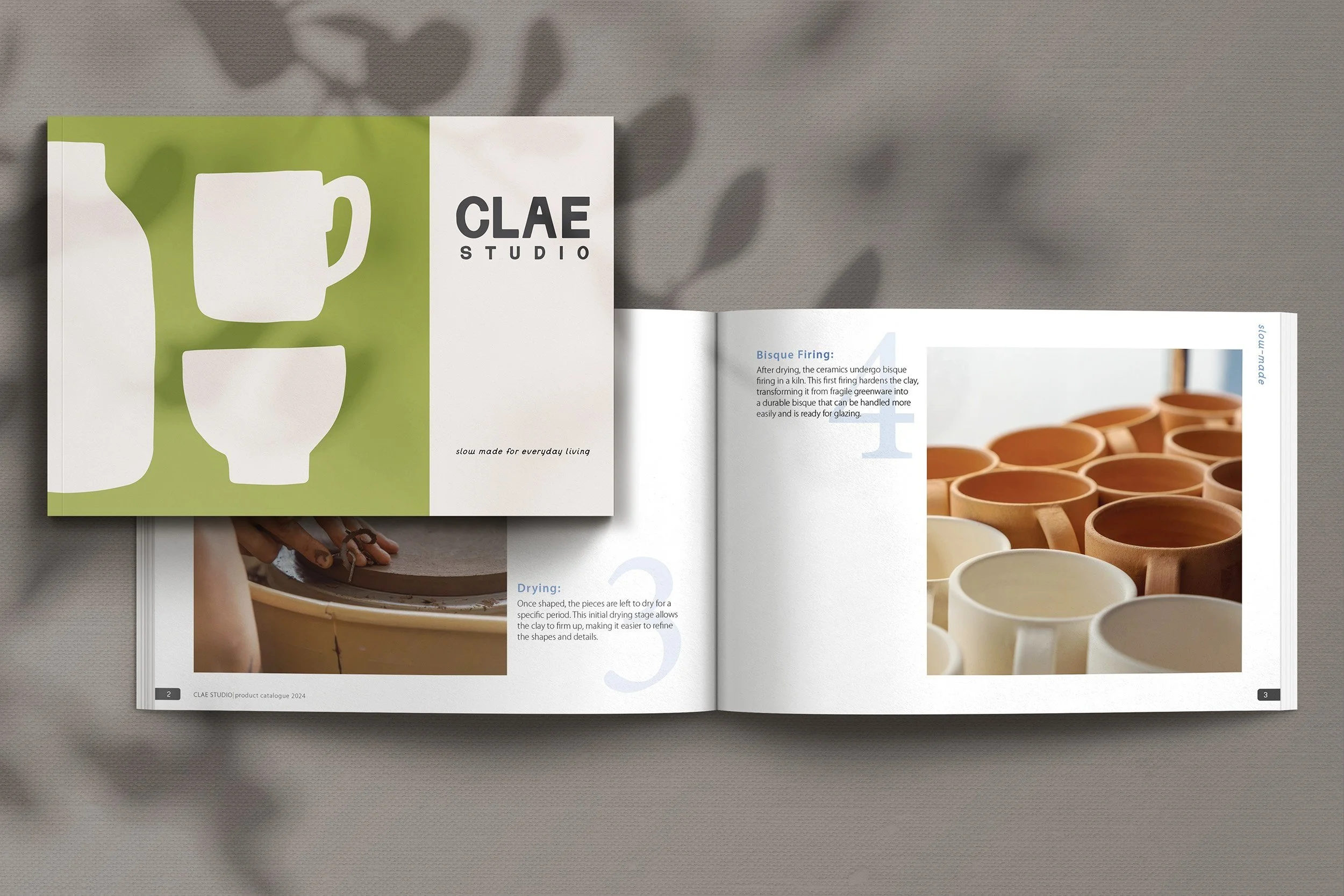 The project also explored how the brand could extend into practical touchpoints, including a responsive website and a brochure catalogue presenting Clae Studio’s ceramic offerings. The catalogue introduces the studio’s work through a step-by-step look at the handmade tableware process, combining editorial layout with clean visual storytelling.