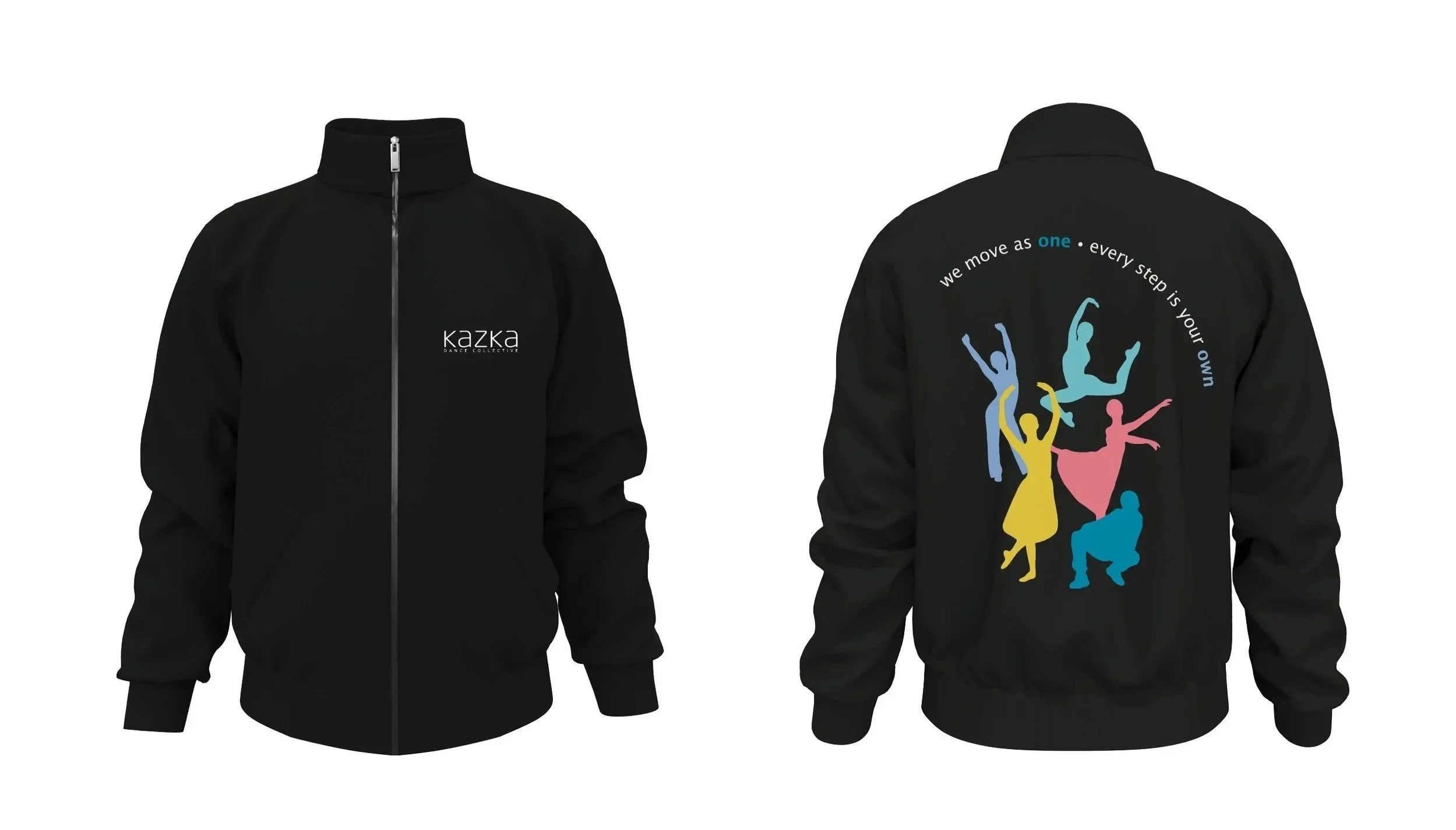 The visual identity was further extended into merchandise with a design for Kazka’s zip-up crew fleeces. The apparel features a silhouette graphic derived from the collective’s dancers, paired with the slogan “We move as one — every step is your own.” The design reflects both the unity and individuality that define Kazka’s community of performers.