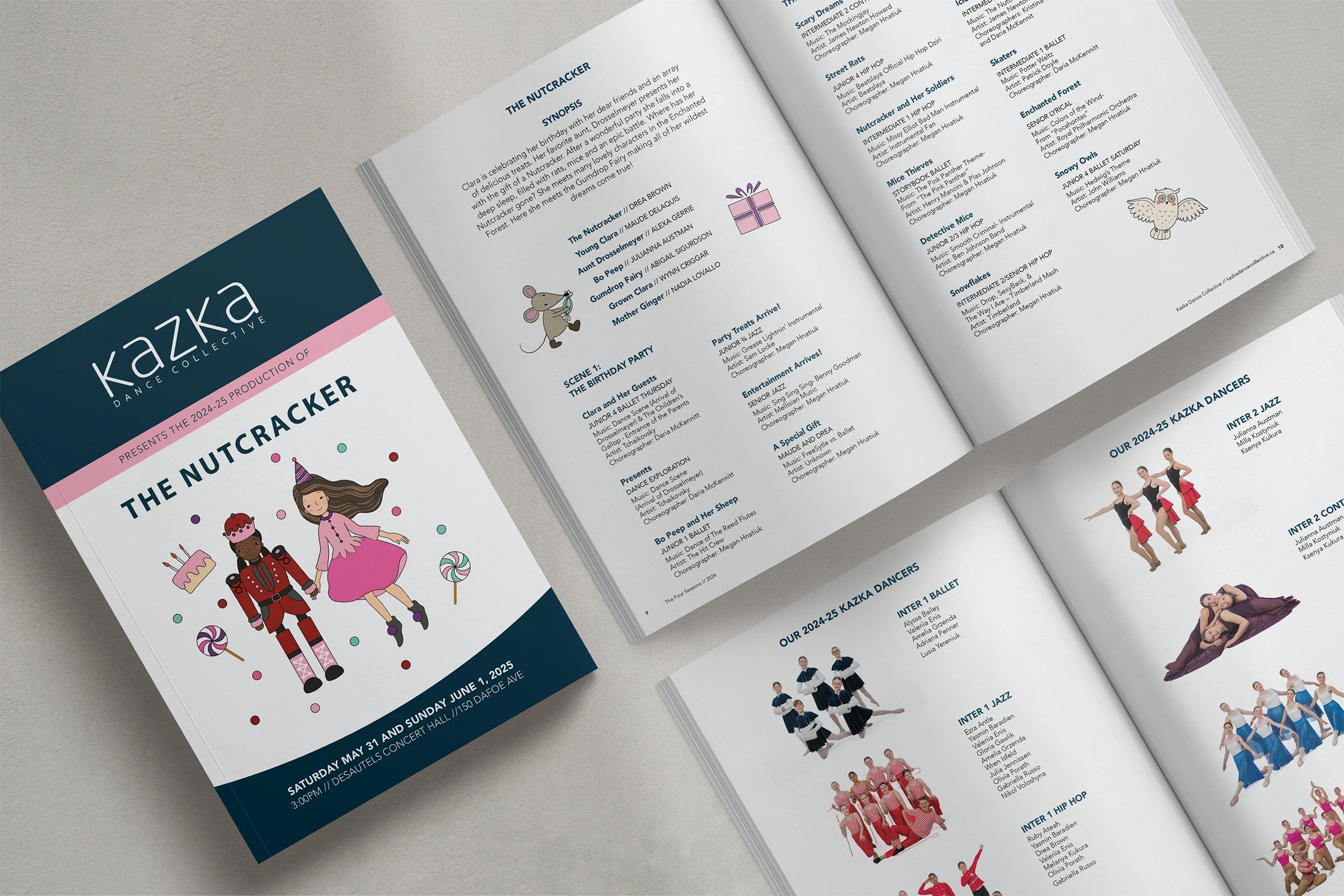 Supporting print materials were also developed for Kazka’s Nutcracker production. The show program balances clean typography with playful imagery to reflect the magic and energy of the performance while clearly organizing cast lists, production notes, and event information for audiences.